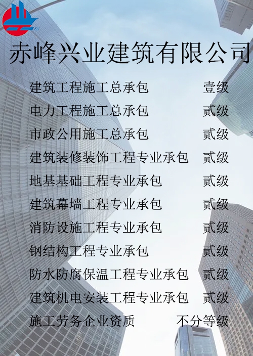 赤峰興業(yè)建筑有限公司簡(jiǎn)介 赤峰興業(yè)建筑有限公司成立于1998年7月,位于內(nèi)蒙古赤峰市松山區(qū)。現(xiàn)已發(fā)展成為擁有建筑工程施工總承包壹級(jí)、電力工程施工總承包貳級(jí)、市政公用工程施工總承包貳級(jí)、承裝、修、試四級(jí)、?建筑裝修裝飾工程專(zhuān)業(yè)承包貳級(jí)、建筑幕墻工程專(zhuān)業(yè)承包貳級(jí)、消防設(shè)施工程專(zhuān)業(yè)承包貳級(jí)、地基基礎(chǔ)工程專(zhuān)業(yè)承包貳級(jí)、鋼結(jié)構(gòu)工程專(zhuān)業(yè)承包貳級(jí)、建筑機(jī)電工程專(zhuān)業(yè)承包二級(jí)、防水防腐保溫工程專(zhuān)業(yè)承包貳級(jí)以及建筑施工勞務(wù)等資質(zhì)的綜合性建筑施工企...